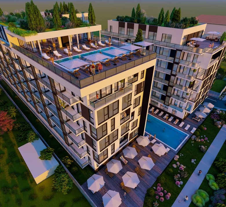 In cadrul Complexului, va puteti bucura de acces la piscină și bar la ultimul etaj, cu vedere către mare, SPA și zonă de fitness, o a doua piscină pentru adulți la nivelul parterului, loc de joacă pentru copii, spații verzi, parcare privată cu acces controlat și sistem de supraveghere video + multe altele.