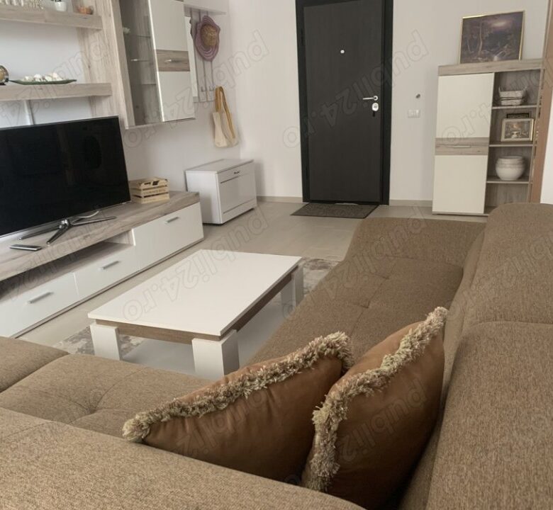 Living: canapea extensibilă, bibliotecă, TV, aer condiționat, cuier, dulap, măsuță de cafea, covor.