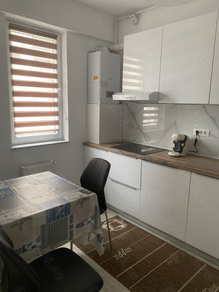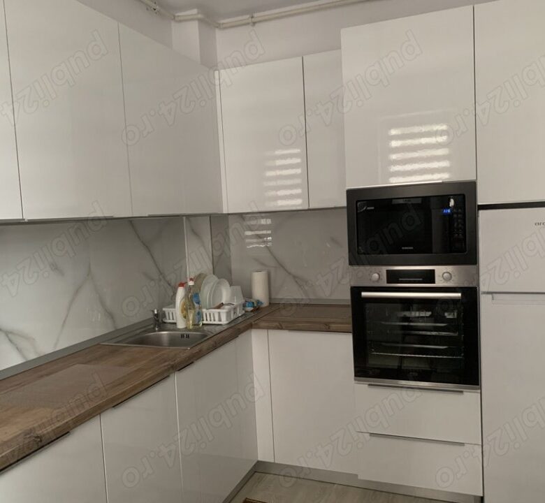 Bucătărie separată (8 mp): mobilată și utilată complet, cu hotă, plită electrică, cuptor și cuptor cu microunde încorporate, mașină de spălat vase, frigider, chiuvetă Franke, aparat de cafea, masă cu 4 scaune.