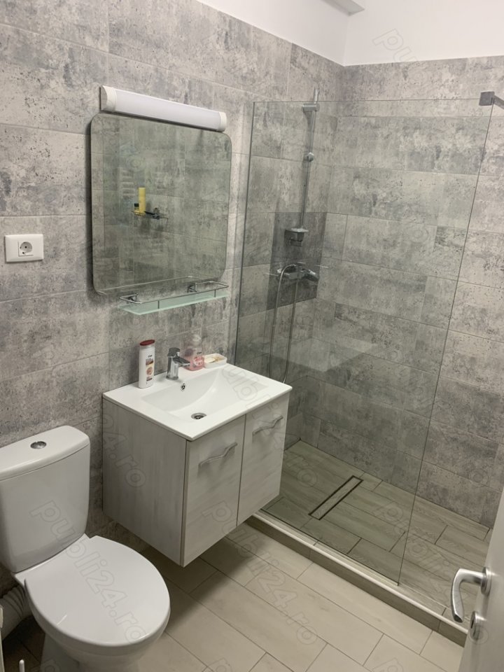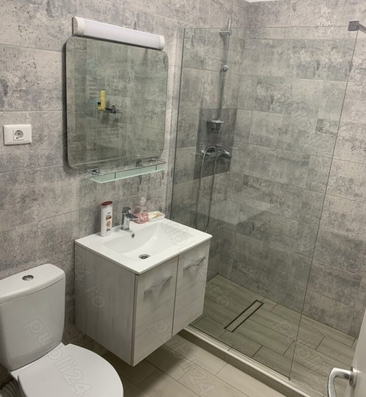 Baie: placată cu gresie și faianță, dotată cu cabină de duș cu geam securizat, chiuvetă cu mobilier, WC și ventilator.
